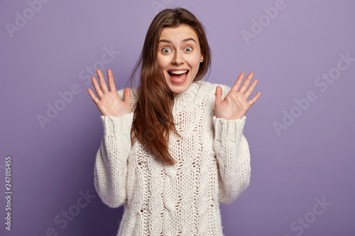 Isolated shot of happy pretty girl shows palms, feels amazed and satisfied, wears casual white winter sweater, overjoyed with good feelings, stands against violet background. People, emotions