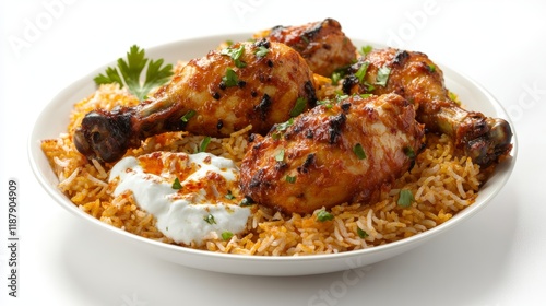 Isolated side view of chicken biryani with yogurt on white background traditional spicy indian food Pakistani fried rice Ramadan dinner or iftar meal
