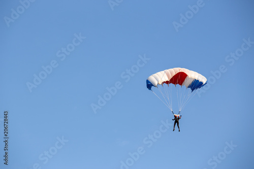 isolated skydiver control colorful parachute gliding after free fall jump with blue sky background