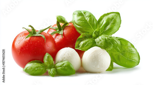 Isolated tomatoes, green basil, mozzarella cheese balls, and white