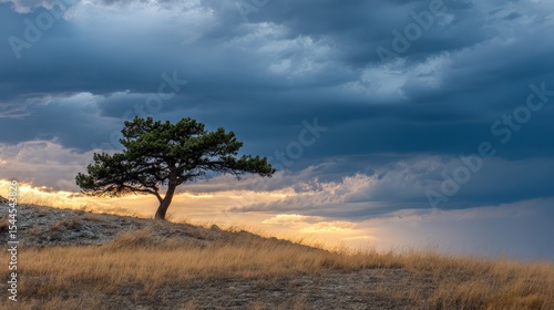 Isolated tree on windswept hill under dramatic twilight clouds