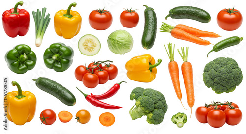 vegetable, food, healthy, fresh, nourishment, diet, raw, organic, ingredient, tomatoes, pepper, cucumber, carrot, broccoli, vegetarian, vitamin, isolated, transparent, background, collection, green, red, yellow, group, object, sweet, spice, herb, natural, pile, eat, health, colourful, plant, cookery, cooking, table, heap, cut, harvest, market, grocery, shop, produce, agriculture, vegan, still life, no people, studio shot