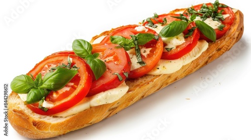 Isolated white background Mozzarella tomato baguette with basil