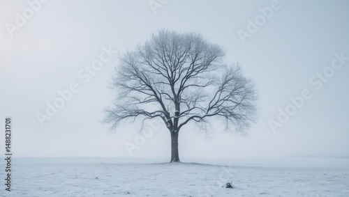 Isolated winter tree with bare branches in a snowy setting
