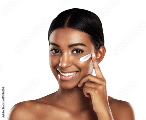 Isolated woman, skincare cream and beauty in portrait, happy or product on face by transparent png background. Girl, model and results for cosmetics, moisturizer and excited smile for facial change