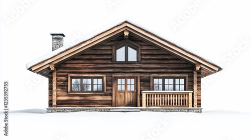 Isolated wooden cabin with snow on the roof, a small porch and a stone chimney on a white background
