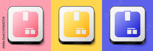 Isometric Carton cardboard box icon isolated on pink, yellow and blue background. Box, package, parcel sign. Delivery and packaging. Square button. Vector