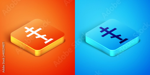 Isometric Christian cross icon isolated on orange and blue background. Church cross. Vector.