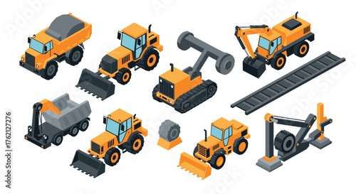 isometric, construction, vehicle, equipment, industrial, orange, grey, machinery, transportation, set, shoveling, bulldozer, shoveling, crane, truck, loader, backhoe, forklift, dump, roadwork, building, heavy, engineering, development, site, gear, hydraulic, infrastructure, work, tool, business, utility, logistic, model, mechanical, structure, detailed, modern, automated, power