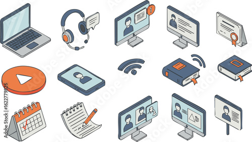 e-learning, distance learning, learning, study, teaching, training, laptop, computer, monitor, earphones, headset, certificate, diploma, tablet, wi-fi, wireless, cyberspace, book, calendar, notepad, presentation, communication, technology, isometric, graphic, vector, connectivity