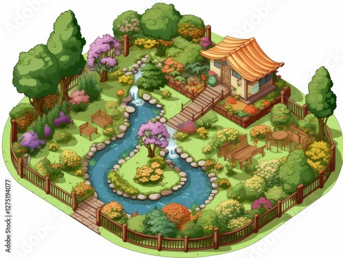 garden, house, stream, flower, shrub, isometric, design, landscape, planning, diverse, nature, park, backyard, zen, plant, building, tree, bungalow, path, peaceful, floral, river, architecture, home, illustration, tranquil, blooming, spring, summer, japanese, decoration, relaxation, serene, scenic, growth, eco, environment, natural, blossom, beauty, botanical