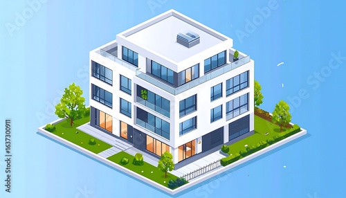 building, apartment, modern, isometric, architecture, design, house, urban, city, residential, complex, flat, contemporary, facades, structure, exterior, property, real, estate, multifamily, white, window, balcony, roof, green, grass, tree, garden, illustration, home