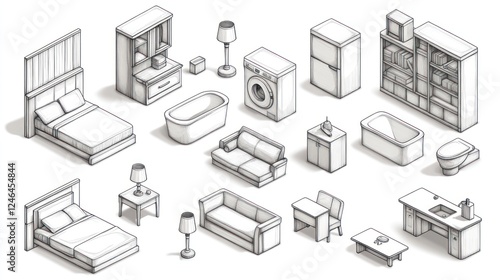 furniture, appliance, home, interior, bedchamber, bathroom, kitchen, living, room, bed, sofa, couch, table, chair, lamp, bathtub, privies, sink, washer, refrigerator, shelf, cabinet, clothes rack, dresser, design, illustration, isometric, drawing, vignetting, white, black, line, art, three-dimensional, model, house, apartment, space, decor, style, modern, classic, comfort, equipment, household, item, object, element