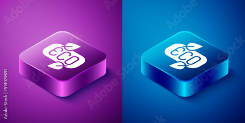 Isometric Leaf Eco symbol icon isolated on blue and purple background. Banner, label, tag, logo, sticker for eco green. Square button. Vector