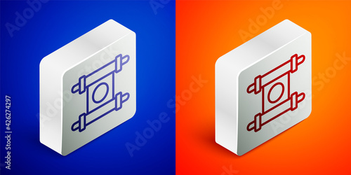 Isometric line Decree, paper, parchment, scroll icon icon isolated on blue and orange background. Chinese scroll. Silver square button. Vector