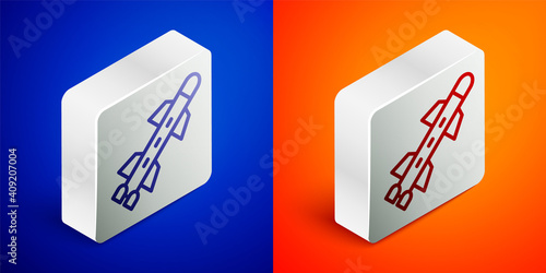 Isometric line Rocket icon isolated on blue and orange background. Silver square button. Vector.