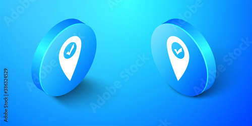 Isometric Map pointer with check mark icon isolated on blue background. Marker location sign. Tick symbol. For location maps. Sign for navigation. Blue circle button. Vector.