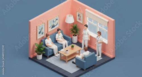 relaxing, isometric, illustration, person, sitting, standing, talking, resting, drinking, hot drink, window, indoor, plant, table, couch, chair, uniform, health care, medicine, occupation, work, clinic, hospital, doctor, nurse, medicals, office, waiting room, cartoon, stylised, small group, communication, discussion, colleague, friendly, calm, minimalist, rendering, cutaway