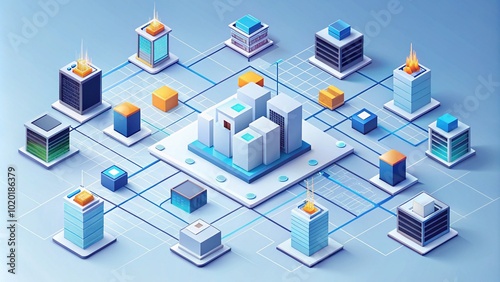 Isometric Minimalist Illustration of Enterprise Resource Planning Data Analysis Network for Business Insights
