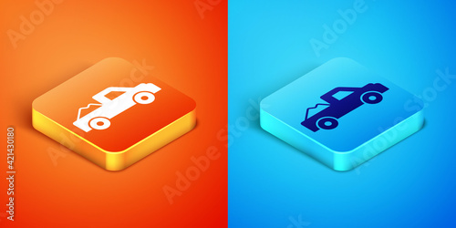 Isometric Pickup truck icon isolated on orange and blue background. Vector