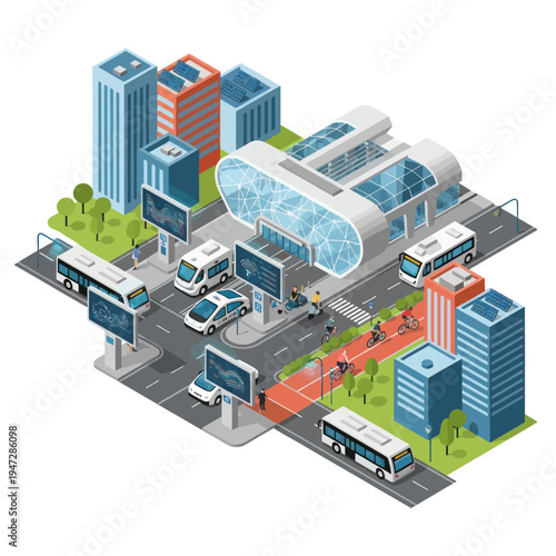isometric, intersection, bicycle, sustainable, urban, transportation, technology, infrastructure, city landscape, environmentally friendly, innovation, futuristic