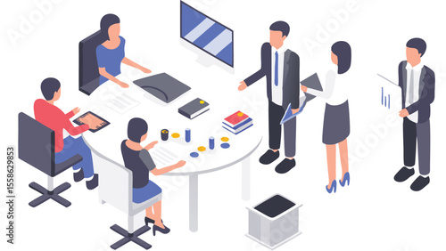 isometric, business, meeting, people, table, presentation, screen, discussion, team, office, corporate, strategy, planning, collaboration, workspace, employee, agenda, document, notebook, monitor, chart, graph, suit, formal, work