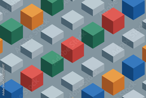 Isometric view of a pattern of colorful cubes with gray cubes scattered across a gray background design