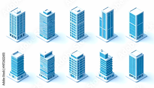 Isometric views of various modern building designs, perfect for illustrating cityscapes.