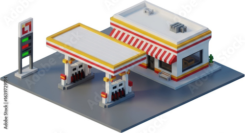 Isometric voxel gas station with canopy pumps and convenience store isolate 3d illustration petrol station