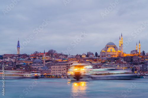 Istanbul, Turkey - Jan 16, 2020: Suleymaniye mosque and passengers Ferry at the Golden Horn, Istanbul, Turkey.