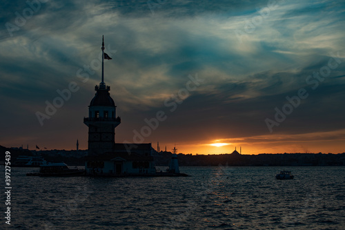 Istanbul, Turkey - September 2020:Maiden's Tower or Kiz Kulesi located in the middle of Bosporus in the beautiful twilight