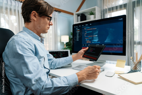 IT developer selecting by point on coding online software development information on tablet comparing with pc and laptop screen with new code program on update version overall system. Pecuniary.