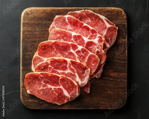 Italian cooked ham slices on cutting board Top view against black background with empty space