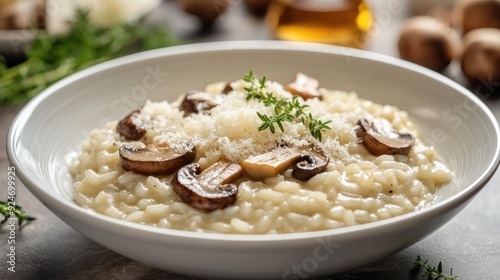 Italian risotto with mushrooms and Parmesan cheese in a white bowl.