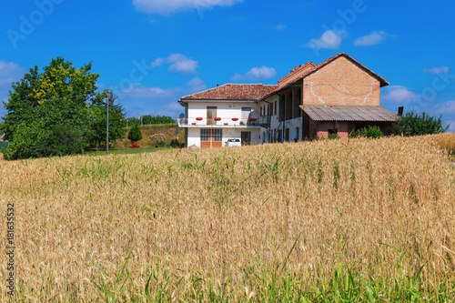 Italian rural landscape. House in the countryside located in the region of Alba in Italy. Wheat field and a small house in the countryside.