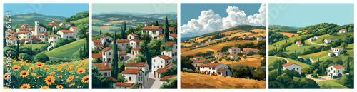 Italian summer village landscape posters set. Rural area. Little white houses hills greens meadows. Bright colors. Vector cartoon style illustration collection