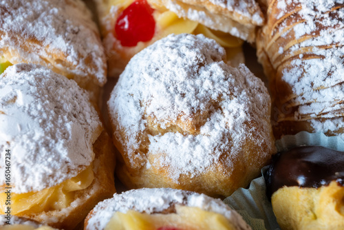 Italian sweet dessert dolce pastry and cakes with cream and fruits on plate made in artisanal bakery in Rome, Italy, close up