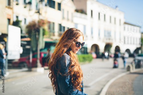 woman, crossing, road, caucasian, travel, day, casual attire, building, outdoors, long hair, people, sun, redhead, sunglasses, half face, mid, adult, padova, 1, waist up, lifestyle, leisure, street, built structure, urban, city, jacket, venetia, italy, transportation