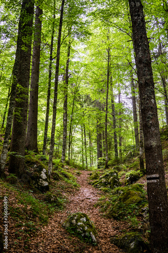Italy, Province of Udine, Tarvisio, Footpath in green springtime forest in Italian Alps
