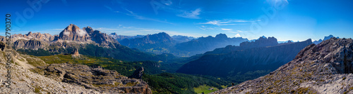 Italy, Veneto, Dolomites, Giau Pass, Tofana di Rosez, Cinque Torri, Cristallo and Lastoi di Formin from the top of Gusela