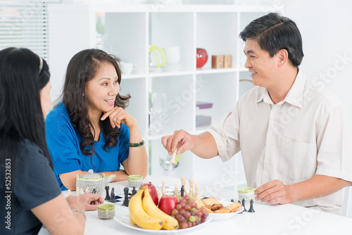 lady, charming, attractive, beautiful, brunette, cup, pastime, game, holding, tea, beverage, enjoying, enjoyment, friends, friendship, girlfriend, indoor, elegant, mid-age, mature, lovely, pretty, togetherness, break, free time, man, male, people, person, lifestyle, asian, vietnamese, woman, female, positive, smiling, happy, joy, joyful, relaxed, carefree, guest, afternoon tea, affectionate, friendly, chess, interaction, communication
