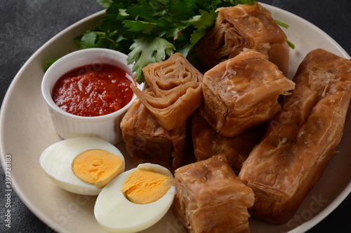 Jachnun or Jahnun, Yemenite Jewish pastry, served with fresh grated tomato and boiled egg and Zhug, originating from the Adeni Jews, and traditionally served on Shabbat morning in Israel.