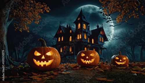 Jack O' Lanterns pumpkins glowing at spooky mysterious Halloween night Digital 3D illustration 6