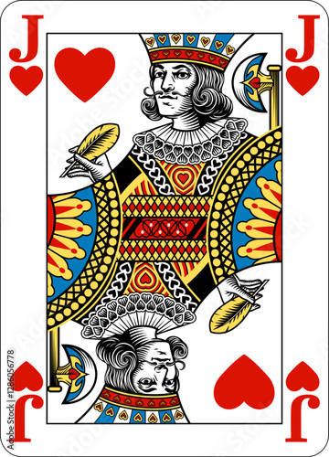 Jack of Hearts design from a new original deck of playing cards. Four pip left handed version with identifier in all four corners.