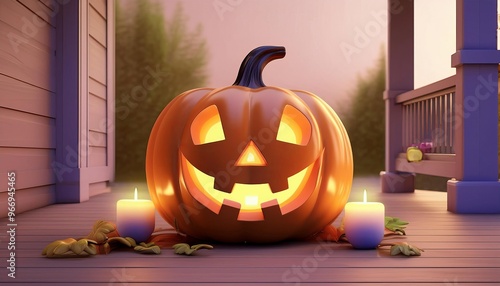 jack-o-lantern, pumpkin, halloween, skittish, scarey, fall, autumn, october, porch, candle, candlelight, wooden floor, leaf, orange, yellow, brown, purple, night, dusk, evening, three-dimensional, illustration, rendering, digital artwork, holiday, festive, celebration, tradition, seasonal, harvest, trick or treat, costume, ghost