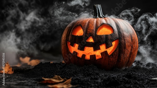 Jack-o-lantern with glowing face surrounded by smoke and autumn leaves