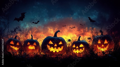 Jack-o'-lanterns glow eerily in darkness, bats flying overhead against a fiery sky