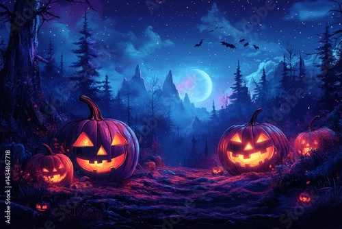pumpkin, halloween, forest, night, skittish, mountain, moon, october, autumn, scarey, dark, tree, wood, mystical, magical, creepy, fantasy, holiday, celebration, illustration, digital, art, design, background, scene, landscape, nature, light, glow, orange, purple, blue, vibrant, mysterious, eerie, ominous, tradition, event, festival, season, fall, winter, gothic, surreal, atmosphere, ambience