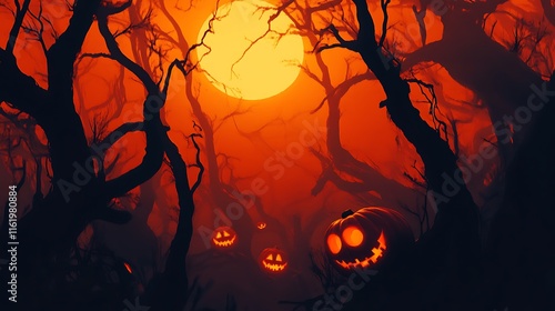 halloween, pumpkin, forest, skittish, orange, tree, night, dark, scarey, october, autumn, fall, mystical, mysterious, creepy, haunted, wood, shadow, silhouette, branch, leaf, glow, light, red, fire, devil, evil, fear, thriller, horror, monster, holiday, celebration, tradition, carving, season, harvest, nature, landscape, background, illustration, art
