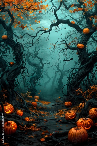 Jack-o-lanterns in a eerie forest with fog in the background. Image for Halloween advertisement. Banner party card with copy space